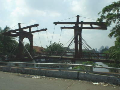 西ジャカルタ、コタ地区にあるオランダ植民地をしのぶ街。1628年に港から小さな船が運河を通過するために造られたもの。近くに運河やVOC東インド会社の監視塔やアウトリガー付きのカヌーの実物を展示する海洋博物館がある。少しチップを渡すと跳ね橋の上に行くことができます。お金がものをいう国です。