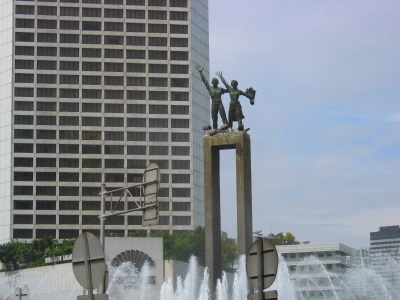 スディルマン通りを北へ行くと、TVでインドネシアのニュースが流れる時によく映る場所がある。大きな噴水の中心にある塔には少年と少女が右手を挙げ、少女の左手には花束を持ち、訪れる人々を歓迎している。後ろに見えるのはマンダリンオリエンタルホテル。
