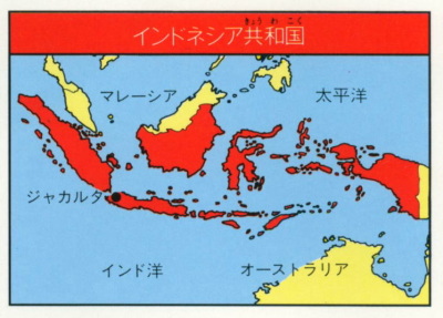 南半球のジャワ島に全人口の65%が集まり、政治経済の中心である。そして、 ジャワ島の西の端近くに首都ジャカルタがある。 |